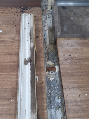 곧바로 미닫이문 문틀을 철거하였는데 해당 콘크리트 부분도 변사체 오염물이 흘러들어간 것을 확인할 수 있었으며 주변에는 다량의 파리 유충(구더기)과 고치가 군집을 이루고 있는 것을 확인할 수 있었습니다.