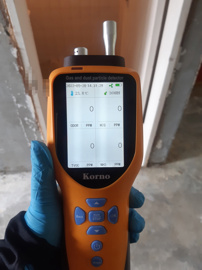 먼저 고인이 사망한 위치를 중심으로 집안에서 발생하는 시신 부패 악취의 가스 농도를 측정하였습니다.