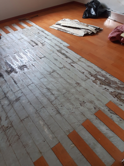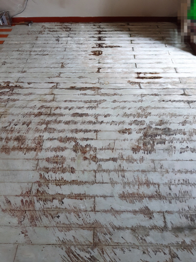 바닥에 시공되어 있는 장판이 데코타일인 관계로 변사체 오염물이 장판을 지나 콘크리트로 흘러들어간 상황이었습니다.