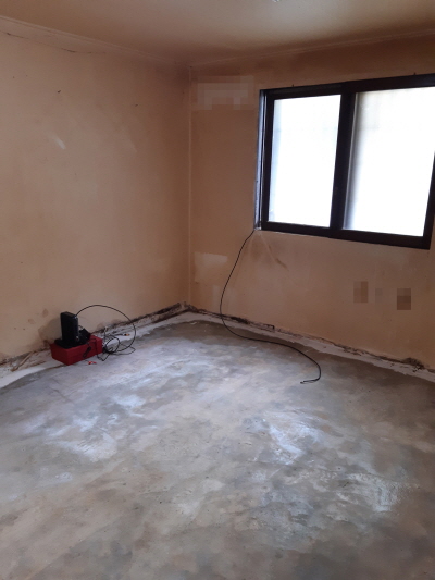 집안의 물건을 모두 정리하여 반출, 폐기 처리를 진행한 뒤, 방안에 오염되어 있는 모노륨 장판을 모두 걷어내었습니다.