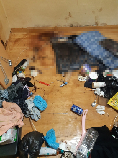 변사체 혈액, 부패액으로 오염되어 있는 침구류 및 가재도구를 모두 제거하였습니다.