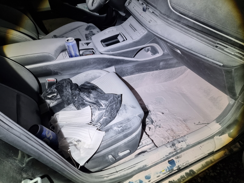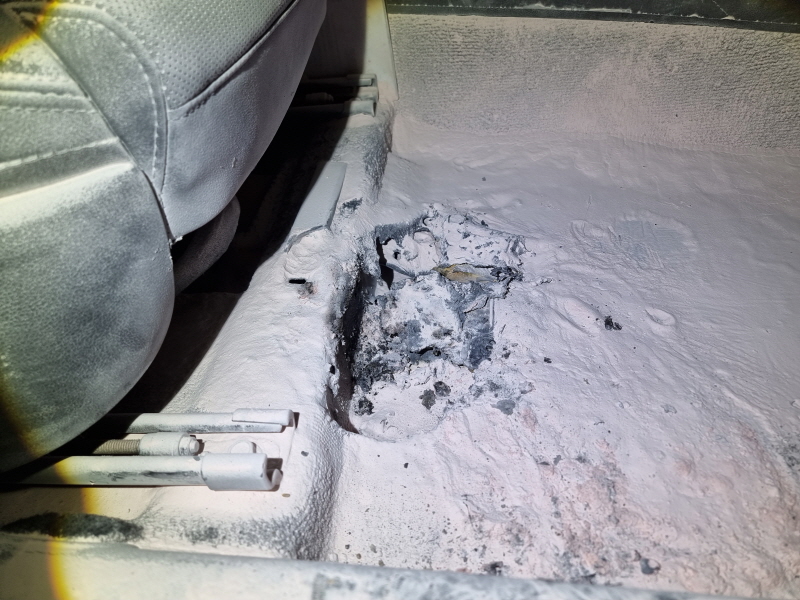 또한, 조수석 바닥 쪽 카펫은 번개탄으로 인하여 녹아내린 상태였으며 해당 부분을 중심으로 다량의 소화기 분말 가루가 쌓여 있었습니다.