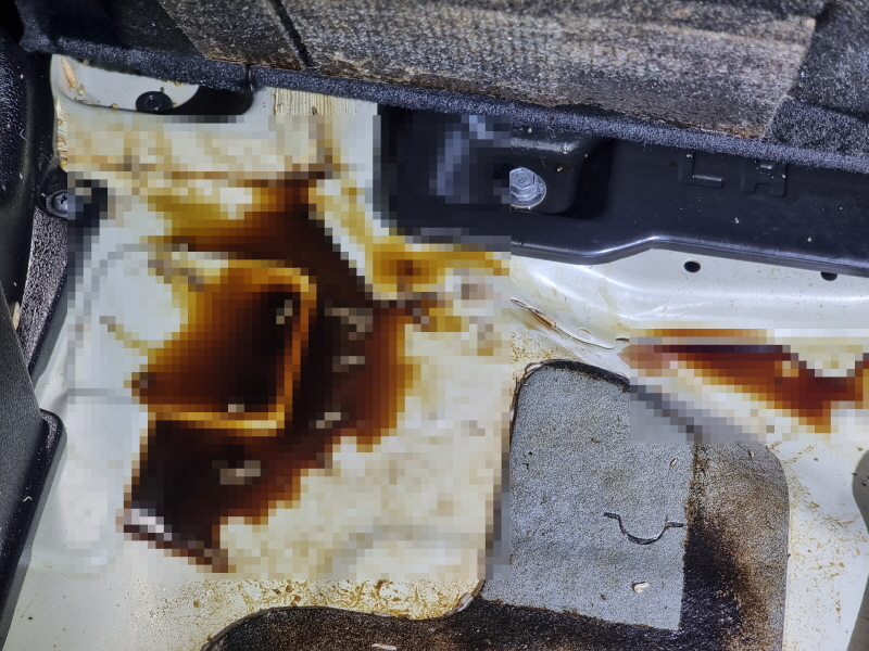 경차인 관계로 내부 구조가 단순하여 프레임 부분까지 확인해 보았는데 다량의 오염물이 차체 바닥까지 흘러내려 갔으며 주변으로는 파리 유충이 발생한 것을 확인할 수 있었습니다.