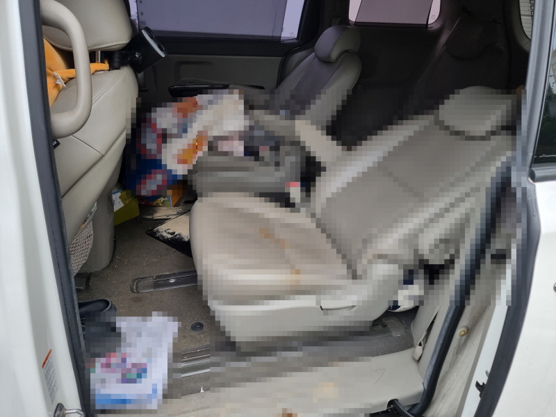 1열 조수석 바닥에는 고인의 사망 원인으로 추정되는 도구와 함께 잔해가 널브러져 있었으며 2열 시트에는 소량의 혈흔이 묻어 있는 상태였습니다.