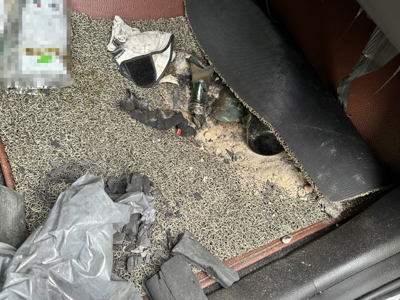 조수석 바닥에 있는 카매트와 카펫은 연소된 번개탄으로 인하여 바닥 철판 프레임까지 녹아내린 상태였습니다.