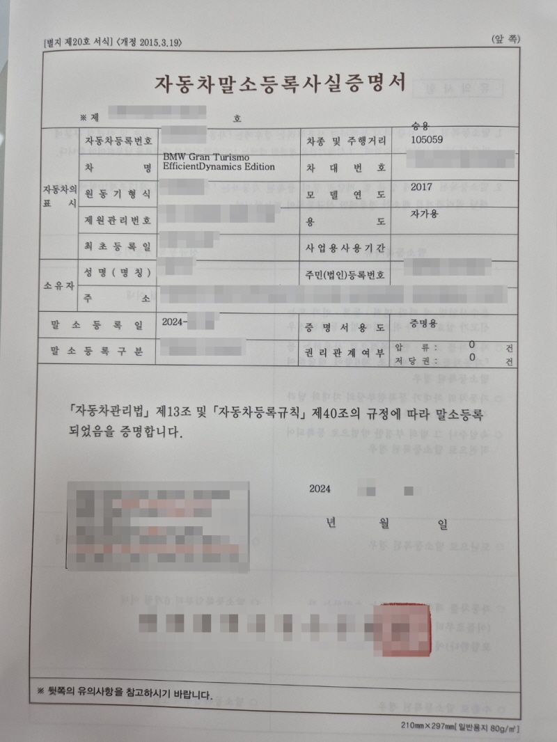 이후, 해당 차량의 말소 처리를 완료하였으며 발급받은 자동차말소등록사실증명서를 유가족분께 송부드렸습니다.