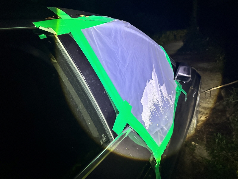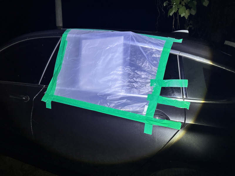 도어 유리는 파손되어 도로변에 널브러져 있었으며 조수석 도어와 운전석 뒷좌석 쪽 도어에는 비닐과 함께 청테이프로 가려놓은 상황이었습니다.