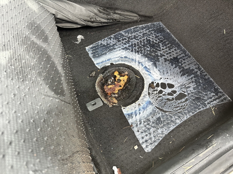 조수석 바닥은 번개탄의 열기로 인하여 카펫까지 녹아내린 상태였으며 차량 실내 전체적으로는 분진과 함께 탄 냄새가 발생하고 있었습니다.
