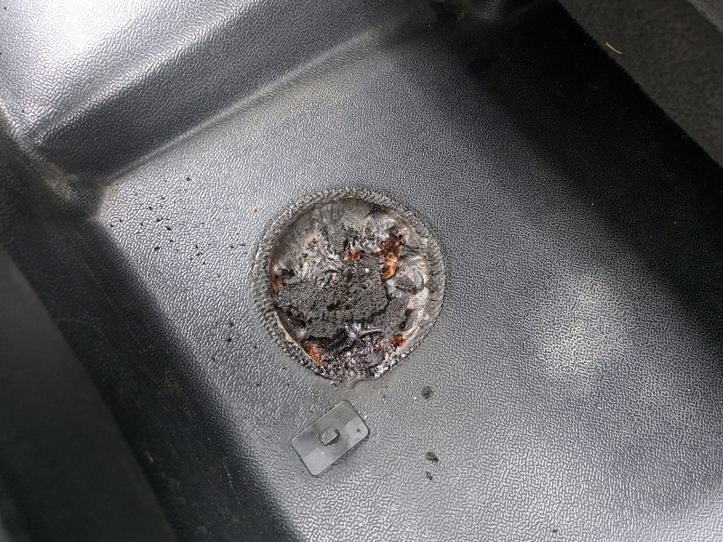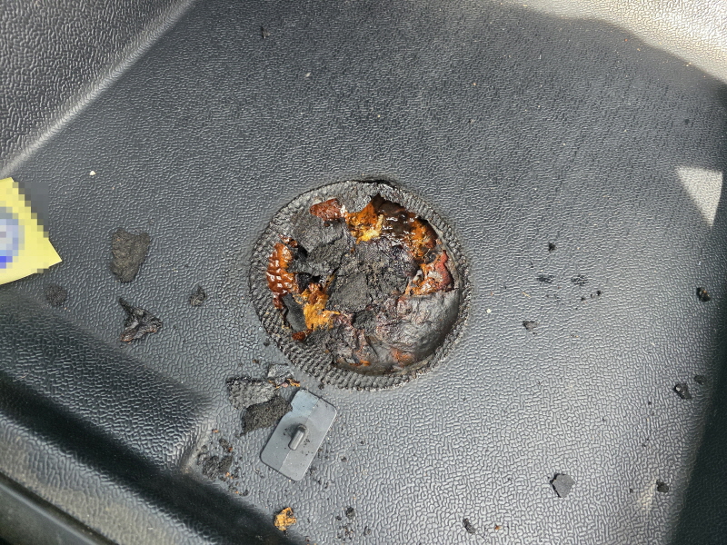 자동차 내부 1열 및 2열 카펫이 번개탄의 열기로 인하여 녹아내린 상태였으며 이에 따른 분진 발생으로 실내 전체에 탄냄새가 진동을 하고 있었습니다.